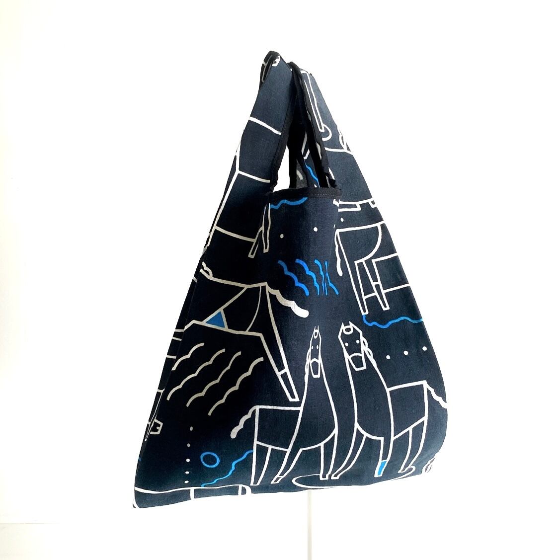 ちょこっとコンビニでお買い物するための小さなエコバッグです。白抜きラインシリーズの図柄を麻の生地に染めて仕立てて、特色でウマ・ブラックバージョンを作成しました。